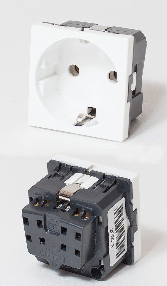 Розетка электрическая с заземлением (2К+З), с защитными шторками, U-ном. 220 В, I-ном. 16 А, размер 45х45 мм - 2 модуля Modul45/"Mosaic", белая