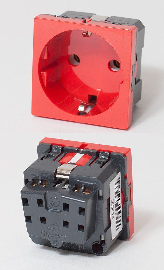 Розетка электрическая с заземлением (2К+З), с защитными шторками, U-ном. 220 В, I-ном. 16 А, размер 45х45 мм - 2 модуля Modul45/"Mosaic", красный