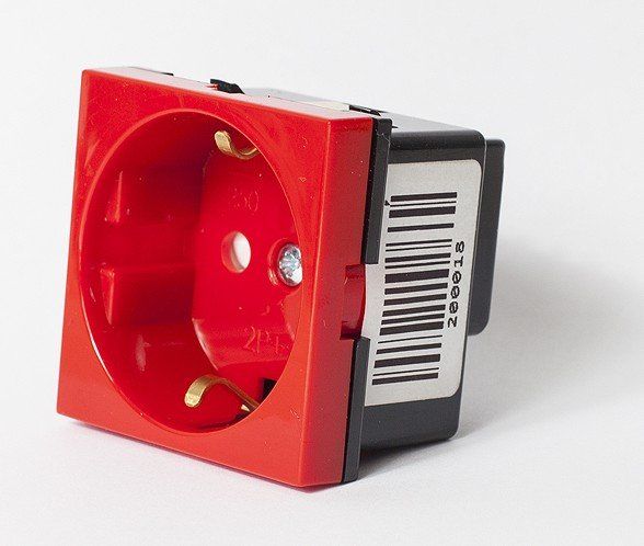 Розетка электрическая с заземлением (2К+З), с защитными шторками, U-ном. 220 В, I-ном. 16 А, размер 45х45 мм - 2 модуля Modul45/"Mosaic", красная