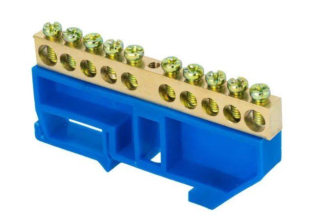 Шина PEN "земля-ноль" без изолятора, 10 контактов, неизолированные отверстия под крепление по краям, сечение шины 6х9 мм, I-нагр. 100 А, t-раб. -40... +50°C, габ.размеры 6х9х90 мм, материал латунь.