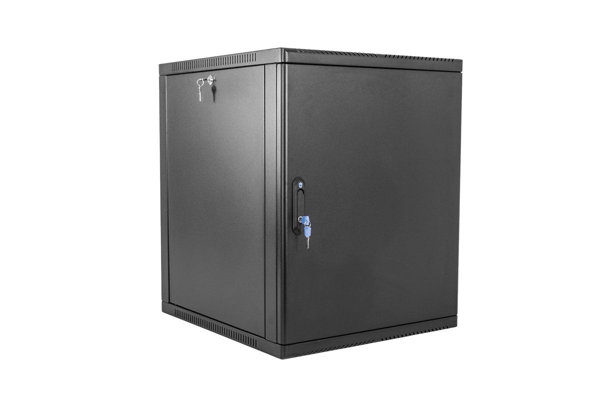 Шкаф телекоммуникационный настенный 19", 12U, дверь металл, полезная глубина 600 мм, съемные стенки, распределенная нагрузка 200 кг, цвет черный, 612х600х660 мм.