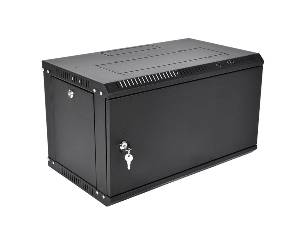 Шкаф телекоммуникационный настенный 19", 6U, дверь металл, полезная глубина 300 мм, съемные стенки, распределенная нагрузка 200 кг, цвет черный, сварной, 346х599х359 мм.