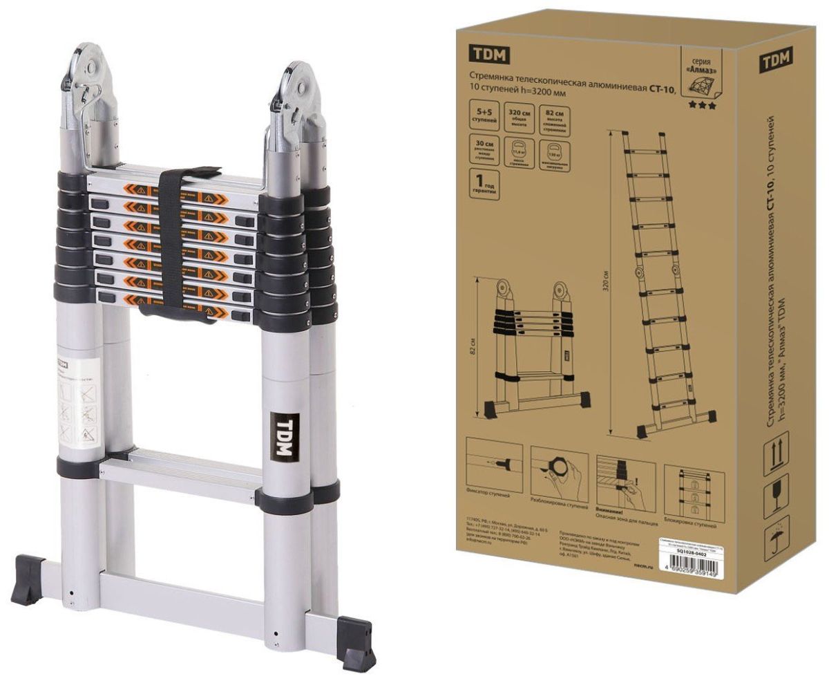 СТ-10, 10 ступеней (SQ1028-0402) Стремянка телескопическая алюминиевая