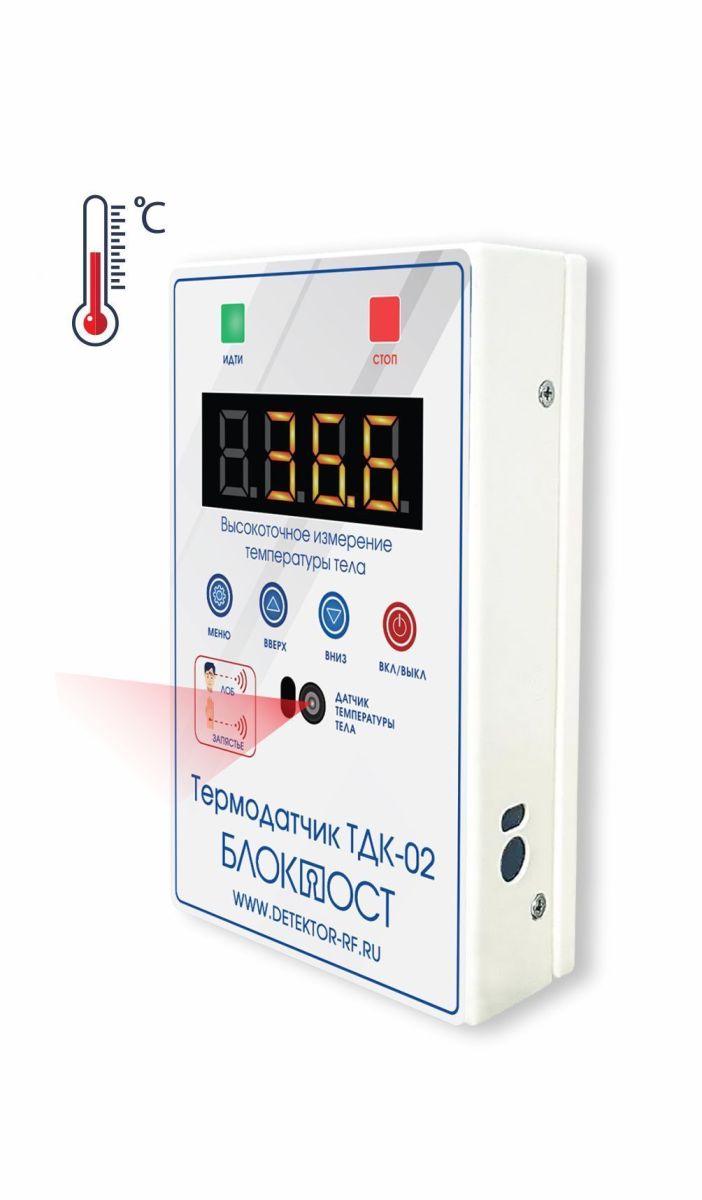 БЛОКПОСТ ТДК-02 – бесконтактное устройство для измерения температуры. Чтобы измерить температуру, необходимо поднести лоб или запястье к ИК-датчику. Устройство озвучит голосовое предупреждение о повышенной температуре тела, не соответствующей норме и предотвратит распространение вирусных заболеваний. При нормальной температуре тела на цифровом экране загорается зеленый индикатор, при высокой – красный.
