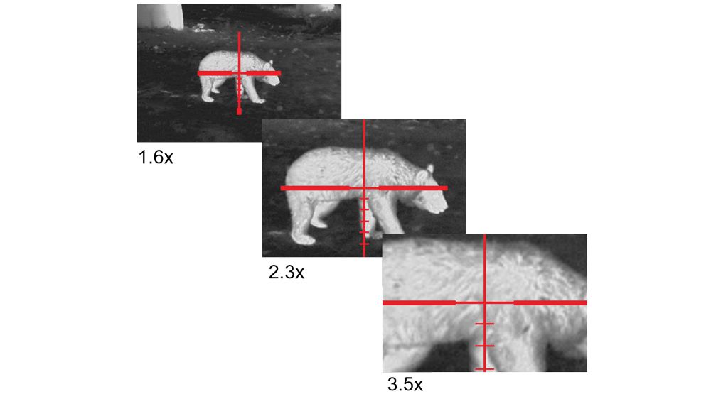 Увеличение устройства равно 2.0X~16.0X и меняется очень плавно. Лося прицел видит на расстоянии до 2800 м. Кабана – на 1400 м. Базовая кратность увеличивается от 2 до 16 крат. Важно отметить, что средняя точка попадания остаётся при любой кратности. Алгоритмы визуализации изображений позволяют вывести картинку в трёх различных вариантах и выбрать среди них самый подходящий для конкретных условий.