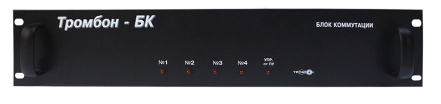 Блок коммутации может коммутировать до 4 блоков "Тромбон - БП-500" и до 4 усилителей "Тромбон - УМ4-120/240"; коммутируемый ток до 5А, 2 входа управления, 480х320х88 мм, 5кг.