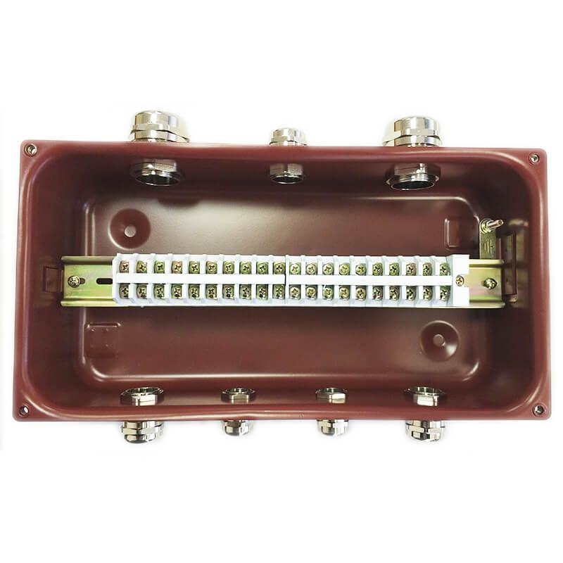Коробка клеммная с латунными сальниками, климатическое исполнением У 2; IP65; сечение жил до: 4 кв.мм; номинальный ток: до 25A; оцинкованная сталь; напряжение переменного тока: 660 В; напряжение постоянного тока: 440 В; t-раб.-40…+60°С; параметры вводов: М20(6-12мм) х2, М25(8-16мм) х1, М32(14-25мм) х1; количество зажимов 10 шт; размеры 260х210х100 мм