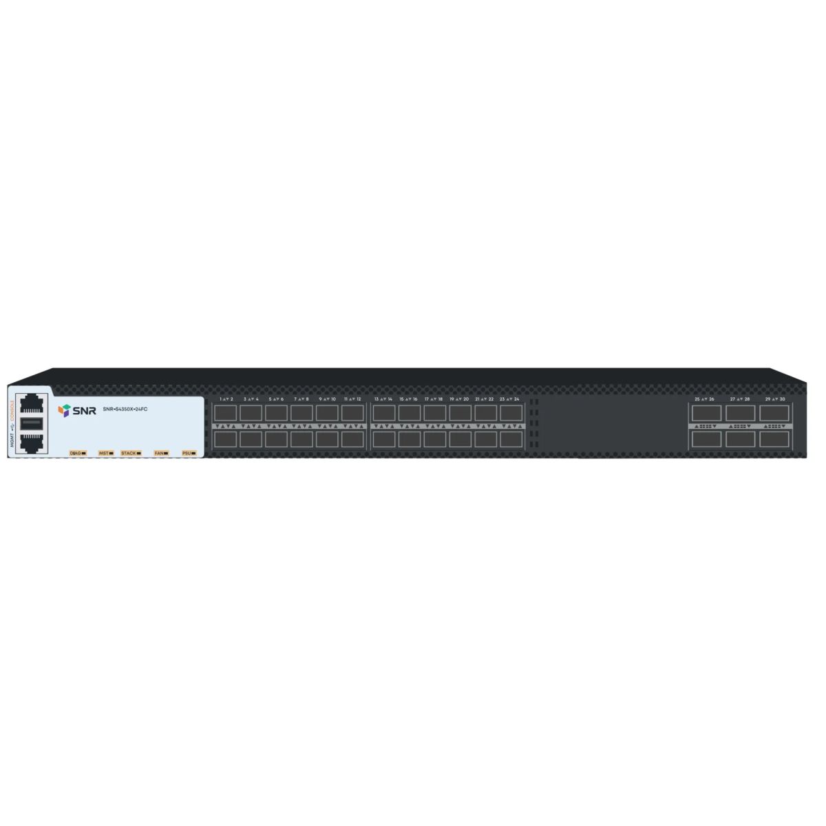 Коммутатор SNR-S4350X-24FC входит в линейку управляемых L3-коммутаторов SNR, предназначен для использования на уровне агрегации и ядра в сетях операторов связи и дата центрах в качестве TOR коммутатора. Коммутатор оснащен 24 портами 1/10G SFP+ и 6 портами 40/100G QSFP28. На коммутаторе реализована поддержка динамической маршрутизации (RIPv1/v2, OSPFv2/v3, BGPv4+) до 16K IPv4 и 8K IPv6 маршрутов, 8K ARP, до 32K MAC. Для увеличения доступной пропускной способности реализован функционал MPLS, включая L3 VPN и L2 VPN (VPLS, VPWS).
