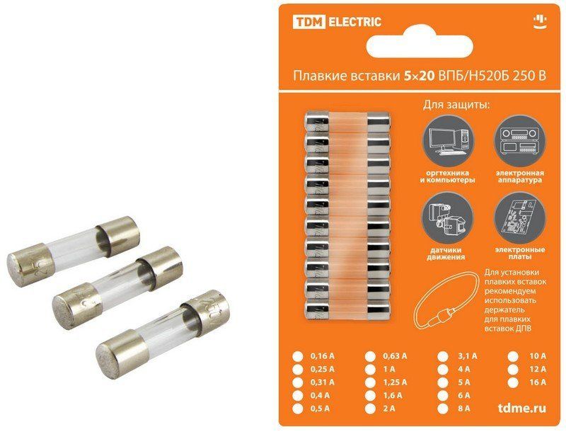 Плавкая вставка (предохранитель); L=20 мм, Ø=5 мм, U-ном. 250 В, I-ном. 0.5 А, блист.упаковка, 10 шт.